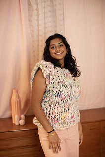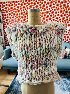This project is make by finger-knitting, then sewing strands together to form fabric.