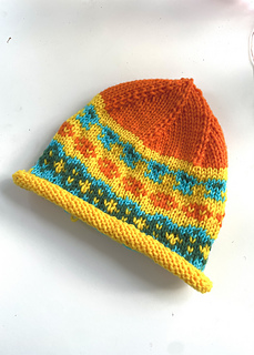 An easy and fun stranded hat in three colors of worsted yarn. This is a variation of the Madison’s Hat pattern, and a great next step if the Madison’s Hat was your first stranded hat. The yellow stitches on the top section make little W’s, hence the name.