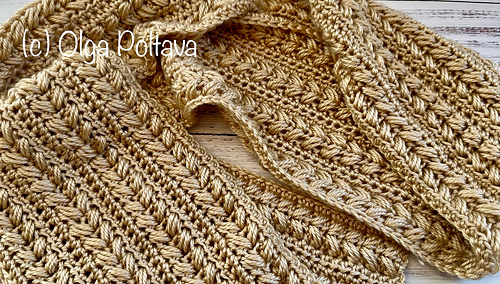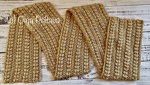 This is a pattern for a crochet scarf, made with worsted weight yarn, category 4, 100% acrylic and size H (5 MM) hook. I used two skeins of Soft & Shiny by Loops & Threads, color Ice Coffee, 1 skein = 311 yards, 170 grams. Total amount of yarn need is about 620 yards or 340 grams.