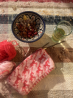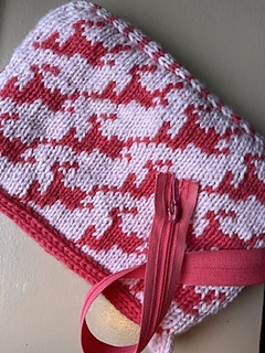 Wild Horses Purse is a small purse that can also be used as a makeup bag or pencil case. The purse is worked in double knitting, which gives a good hold so you don’t have to sew in lining. The purse is worked from the bottom up in double knitting with colourwork. First, the bottom is worked as a rectangle back and forth in double knitting with stripes, after which stitches are knitted up along the sides. From here, the sides of the bag are worked in the round with decreases on the two end pieces, so that the bag tapers towards the top. The bag is finished in with a flap at each end, and a placket closure along both long sides, in which the zipper is finally mounted.