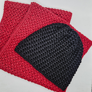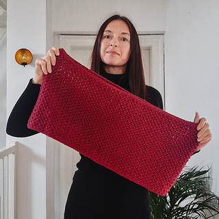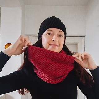 The scarf wraps twice around the neck and has adjustable circumference. The beanie is worked in continuous rounds with adjustable height. Both pieces are beginner-friendly with full video tutorials for each.