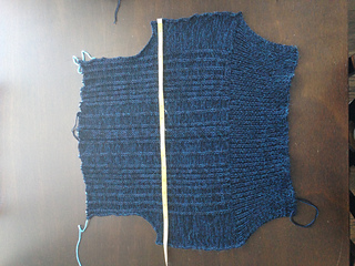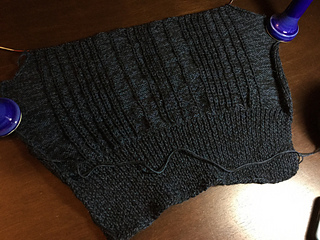 FAILED Mods: st gauge 5.5 sts = 1 in., so removing 14 stitches overall: 8 in back and 3 in each front to maintain finished measurements. Removed a single purl stitch in the first and last repeats and the center purl segments in the center of in the back in other words, (M1, p4)x3 becomes (M1, p3)x3 and the two p3’s in the center of the back become p2’s.