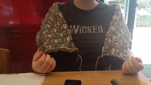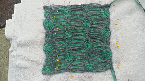Nearly dry and softly blocked. Very drape-y and soft. Reminds me of peacock feathers, even if the color isn’t quite right. Cool!