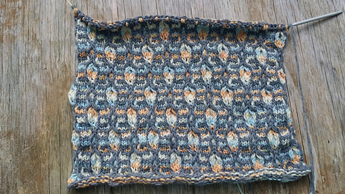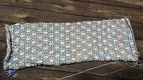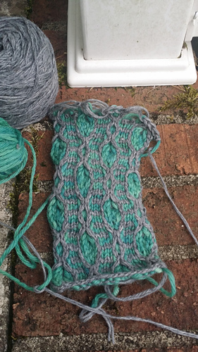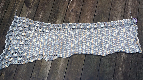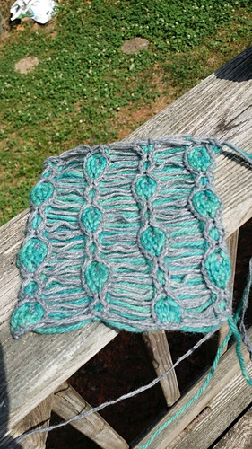 6/9/14 - about 1/4 done - 6 repeats across and 6 up and down - yielding 16” x 16” (will be wider but not longer after dropping stitches). I have used 103 yds of the CC (the Fishermen’s Wool) and 136 yards of the double fingering - so I should have enough to make a 60” wrap - Doing a happy dance. On the other hand, I found a ‘boo-boo’ this morning - can you spot it? (about 2 up and 3 over from the lower left hand corner)… it’s gonna be tricky because it’s one of the drop-stitch areas - but hoping I can stretch it across the gap, because it would take too much effort to redo. Probably should drop it now and see (like I did with my Clapotis), but I’ve got a deadline to make!