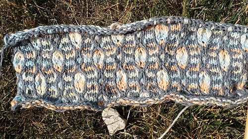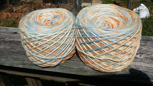 6/6/14 - Yarn dyed on an 8 yard repeat (blue/peach/cream approx 2-1/2 yards each) and knitting has begun. Striping by rows (instead of multiple rows), alas, and no time to dye something else, and so it goes. Maybe gradient mini-skeins? Using larger size needle than swatch (US 9 instead of US 6) to make a less dense fabric. Pattern much more automatic now that I’ve done the swatch. First couple of rows are the trickiest! I think it’s going to be beautiful anyways. Pictures soon! MakerFaire NC tomorrow! :)