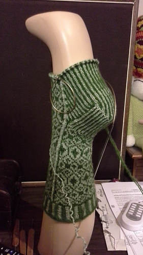 I use the corrugated ribbing, and the fair Isle patten from the morphology mits, the rest I’lljust ….figure out while knitting. Write down my ‘pattern’ here for the second sock ;-). Always nice to have them in pairs.