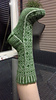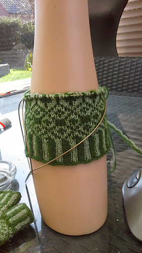 Cast on in dark green 88 stitches, knit 12 rows of corrugated ribbing. Knit 2 light green, purl 2 dark green etc. Work first and last row of cuff in dark color.