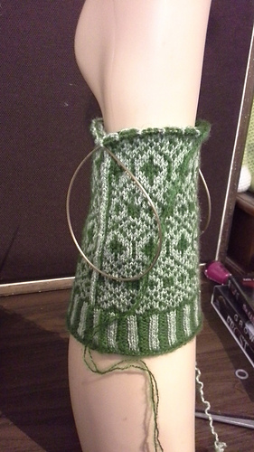 Keep on working in pattern, and creating stripes of alternating colors in the gusset.