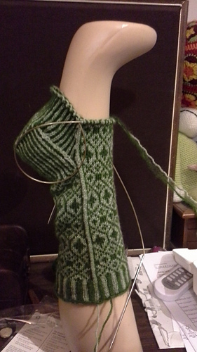 Knit past the heel today, halfway the gusset ; time to fit. And :it fits !!!!! It is much too large for the dummy leg now, but that is how it should be.