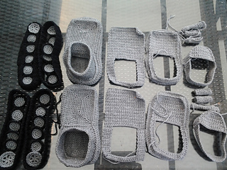 - Make wheels from wide bands that I will roll up, so they fill the track.That will look soooo much better and be easier to assemble. Just a little more crocheting, but the design is worth it.