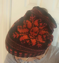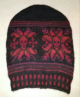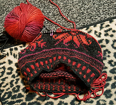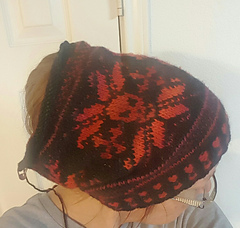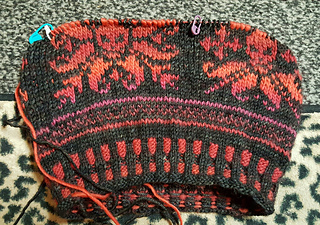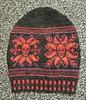 Cast on twisted german stitches 120 on size 2 us needles, purl one row, k2, p2 one row, then alternated 2 x2 in black in red in sts, then, worked ribbed stitches 2 x 2 with the red and black yarn for 12 rows.