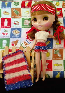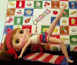 Blythe took up yoga, so she needed an outfit, as well as an exercise mat. She is learning all those difficult poses! The mat is felted and I finished the edge with a blanket stitch. Cropped top can be worn with buttons in front, or back.