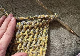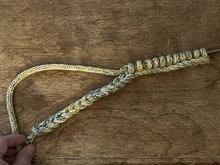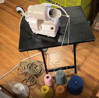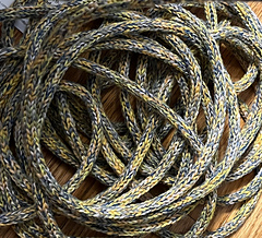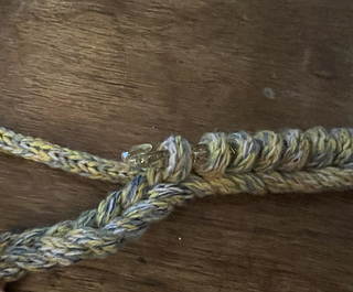 First, I created Icord on an electric Icord machine. Then using interchangeable addi 8mm plastic crochet hook with cable I chain stitched 25 stitches.