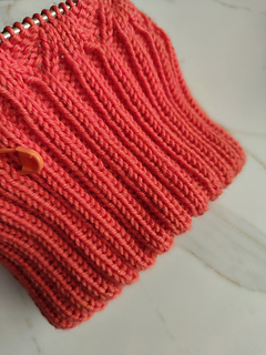 Переместить петли, провязав перехлёсты в 1-м и 3-м ряду после формирования отворота. Должна получиться резинка 4х4.