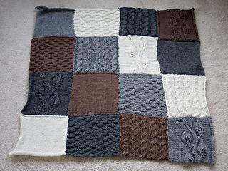 (Pictures match, from the bottom up.) I began by knitting plain stockinette squares. I then used 100 Afghan Squares to Knit by Debbie Abrahams and knit the Sea Wall basketweave and Twine cables patterns from the book. The last set is from the Embossed Twining Vine Leaf from Barbara Walker.