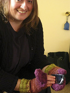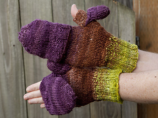 I finished the first mitt on 11/27/2011. I wouldn’t call it successful yet - it’s definitely a proto-type, and I’ll rip and re-knit it. The purple flip-top was too big and gapes open, and I need to extend the fingerless part underneath. On the thumb, the fingerless part was a bit too long. But other than that, pretty good!