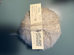 This yarn is from a small spinnery on the Swedish island of Gotland. It is soft and fuzzy, almost like mohair. The manufacturer does not recommend needle sizes or gauges. it is available in natural shades of off-white, grey and black, and in a few dyed colours.