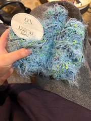 Has a shiny, fine plied boucle thread loosely plied with an eyelash strand.