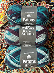 The older green label says simply “Kroy 4-ply” and may have 203 yds. in 50 grams, while the yellow label says “Kroy Socks” hand has 192 yds. in 50 grams. The tan label says “Kroy Socks” with 166 yards in 50 grams. All of the above show gauge of 28 sts/4” for knitting. The new gray label shows same put up as the tan label but with a 32 sts/4” gauge for knitting.