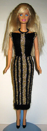 This sleeveless, mid-calf dress has a close-fitting bodice and slim skirt. It is worked sideways in black and gold vertical stripes.