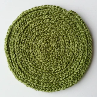 Round coasters measuring 11cm in diameter. They are made by knitting a long i-cord then rolling it into a spiral. The pattern can be easily altered to make smaller or larger mats or placemats.