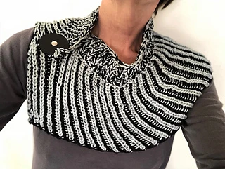 A reversible wrap/cowl that looks like it was done in the Brioche stitch that can be intimidating to some. This version however is done in the Fisherman’s rib stitch that is easier to accomplish and perhaps a bit more fun to knit in a yarn as shown that has a bit of a spring to it.