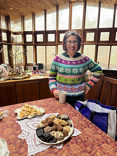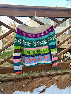 Starting at the neckline, this sweater is worked seamlessly from the top down starting with a ribbed neckline. Short rows are added to shape the neck and the stranded yoke is worked. The sleeves and body are separated and worked in the round.