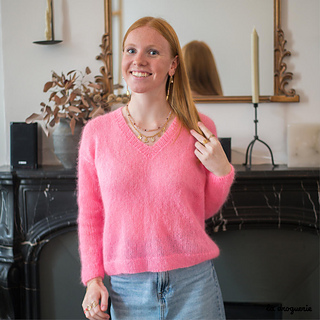 Pull très mousseux tricoté en Comète (60% mohair super fin, 26% Polyamide et 14% Fil métallisé). Modèle droit, ample, à emmanchures basses. Le bas et les poignets sont bordés de côtes 1/1 tout comme la profonde encolure V.