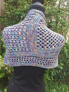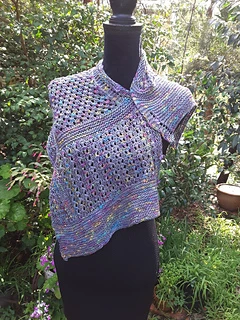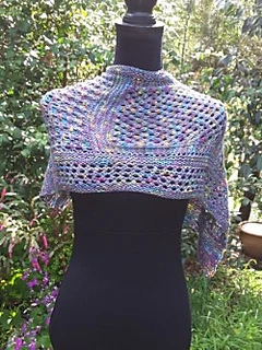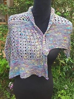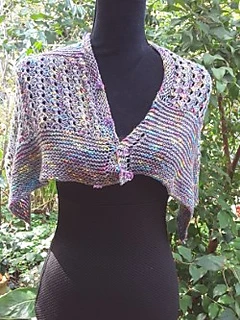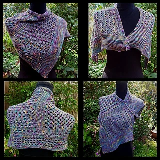 “Silken Opal’ is light and lacy wrap that can be worn number of ways by fastening the buttons into the eyelets used in the pattern.