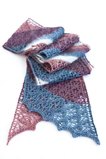 The Xyno scarf is an ode to colorful banding and derives its name from the word onyx spelled backwards. Xyno plays with colorways and lace patterns that alternate with small sections of stockinette in varying colors. Next to color banding, a gently fluffy mohair yarn gives some texture to the scarf, for added fun. The small bands make Xyno very suitable to customizations, so go for a short or super long scarf as you please.