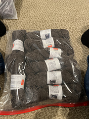 I knit six stitches per inch using #5 needles, although I’ve used needles as small as #3 and as large as #10. The white and lighter grays dye well, the medium gray dyes with an interesting heathery look. The brown is too dark to dye well.