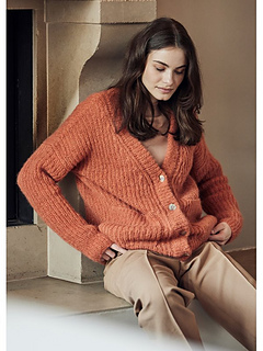 Lana Grossa-Qualität „Setasuri Big“ (70 % Alpaka (Suri), 20 % Seide, 10 % Schurwolle (Merino), LL = ca 100 m/25 g): ca 300 (300 - 325 - 350) g Rost (Fb 508); Stricknadeln Nr 3 und 4; lange Rundstricknadel Nr 3; 4 Knöpfe in Beige mit ca 22 mm Durchmesser.
