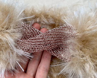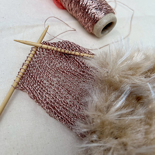 ラメ糸「あたかも」で編んだ箇所は、編み端をとじて筒状に。