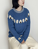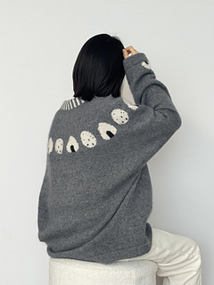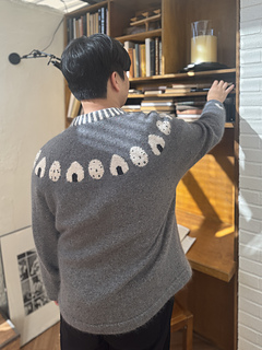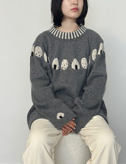 An onigiri motif is placed at the lower right sleeve worked using the intarsia technique and finished with decorative stitch detailing for a subtle yet distinctive accent.