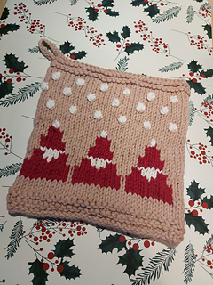 Knitted pot holder in DROPS Paris. The piece is worked bottom up with Santas, bobbles and snowflakes. Theme: Christmas.