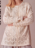 Very oversized, lace and texture patchwork pullover knit in 18 pieces. With angled armholes, round neck, and crocheted edges.