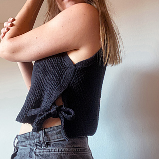A contemporary summer tank with an open side detail and textured stitch pattern – designed for advanced beginners who love clean lines and thoughtful construction.