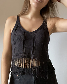 To finish, the shoulder straps are worked to the desired length and seamed, and the fringe is trimmed for an even, flowing edge. The result is a thoughtfully designed knit with movement, texture, and effortless summer appeal.