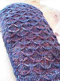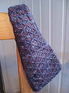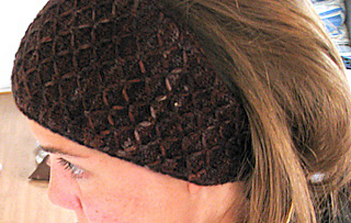 A shaped headband knit in a slip stitch pattern making a warm and firm fabric that won’t stretch out of shape. The work is finished with an applied I-cord edging.