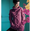 “Twinkle’s signature bulky style issues a decree that hefty knits can be graceful too. A bobble vine climbs the sleeves; the reverse stockinette body, worked in one piece to the underarm, stars a front-and-center hourglass cable with bobble clusters. A dramatic stockinette cowl neck and kangaroo pockets complete the vibrant tableau, rendered here in Cascade Yarns’ ‘Magnum.’”