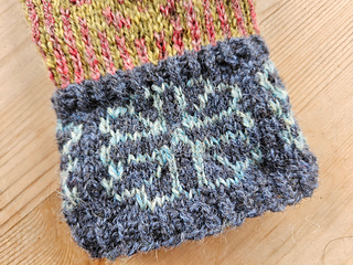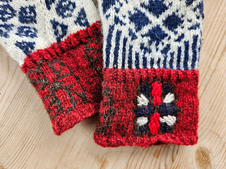 Votten har såkalt livlinjetommel, som gir god passform, og den har flat felling på vottetoppen og på tommelen. Den strikkes med to farger på mansjetten og to andre farger på selve votten, og så kan du leike deg med litt broderi i flere farger til slutt.