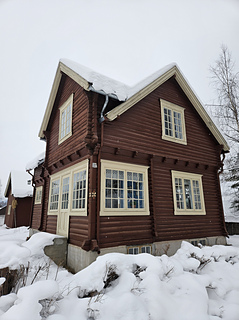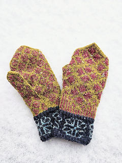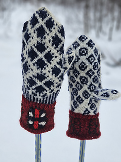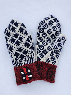 Disse vottene er inspirert av et av husene i Boligfeltet på Maihaugen, et sjarmerende, rødbrunt tømmerhus, med en søt, liten blomst til pynt på hjørnet mot veien. Huset er representatnt for 1920-tallet, og sto i Søndre gate på Lillehammer før det ble flytta til Maihaugen nitti år senere. Det er mye som kan inspirere til et vottemønster i dette huset – valget falt på blomsten på hushjørnet, som pryder mansjetten, blondegardinene i vinterhagen på håndryggen, og i håndflata en stilisert versjon av den blåblomstrede voksduken på kjøkkenet.