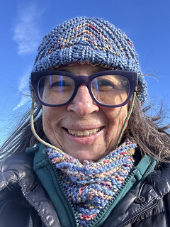 2 sks Silky Twist (shown in A: S4 (blue) and B: 1021) Blue/Multi Garter version sufficient for both hat and cowl