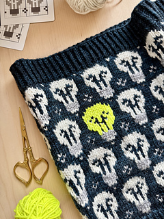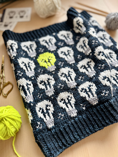 This pattern is worked in the round, beginning with a ribbed bottom edge, followed by stranded colorwork, and finishing in ribbing along the top edge.
