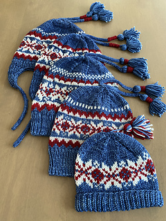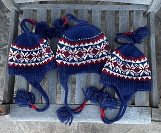 Worsted weight yarn in dark navy, bright red, and winter white. Small amounts of red and white are used so one skein can make ~4 hats. Two skeins of navy will make three hats.