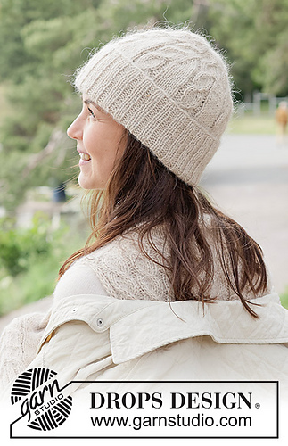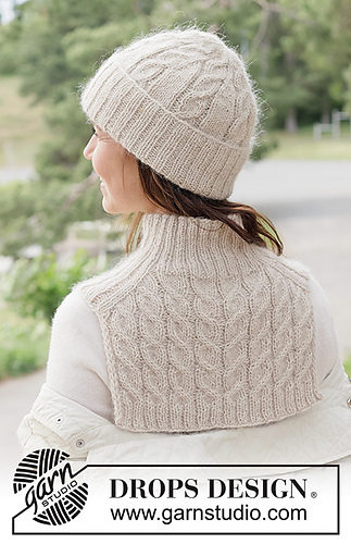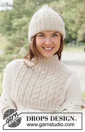 Knitted neck-warmer and hat in DROPS Puna and DROPS Kid-Silk or DROPS Merino Extra Fine and DROPS Kid-Silk. The piece is worked with rib and cables.