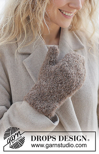 Knitted mittens in DROPS Alpaca Bouclé and DROPS Brushed Alpaca Silk. The piece is worked in stocking stitch.