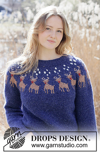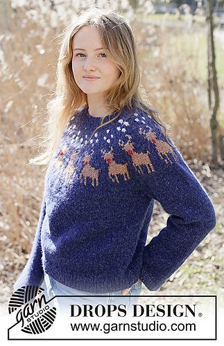 Knitted jumper in DROPS Air. The piece is worked top down in stocking stitch with round yoke, multi-coloured pattern and reindeer. Sizes XS - XXXL. Theme: Christmas.