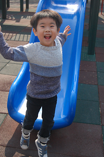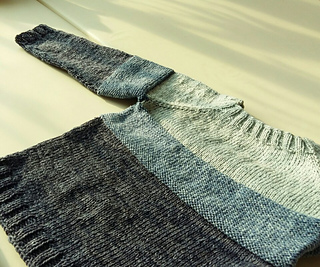 This denim pullover is worked in the round from the top down. You use three color yarns with knit and purl. It is so easy but very adorable.