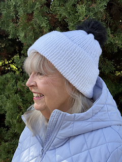 The white hat knit in Caron Simply Soft is slightly larger than the green hat in the pictures. It is my favorite for using in the Sentro machine. Your personal gauge may vary slightly but the hat should still be a great fun alternative to the usual circular machine knitting beanie.